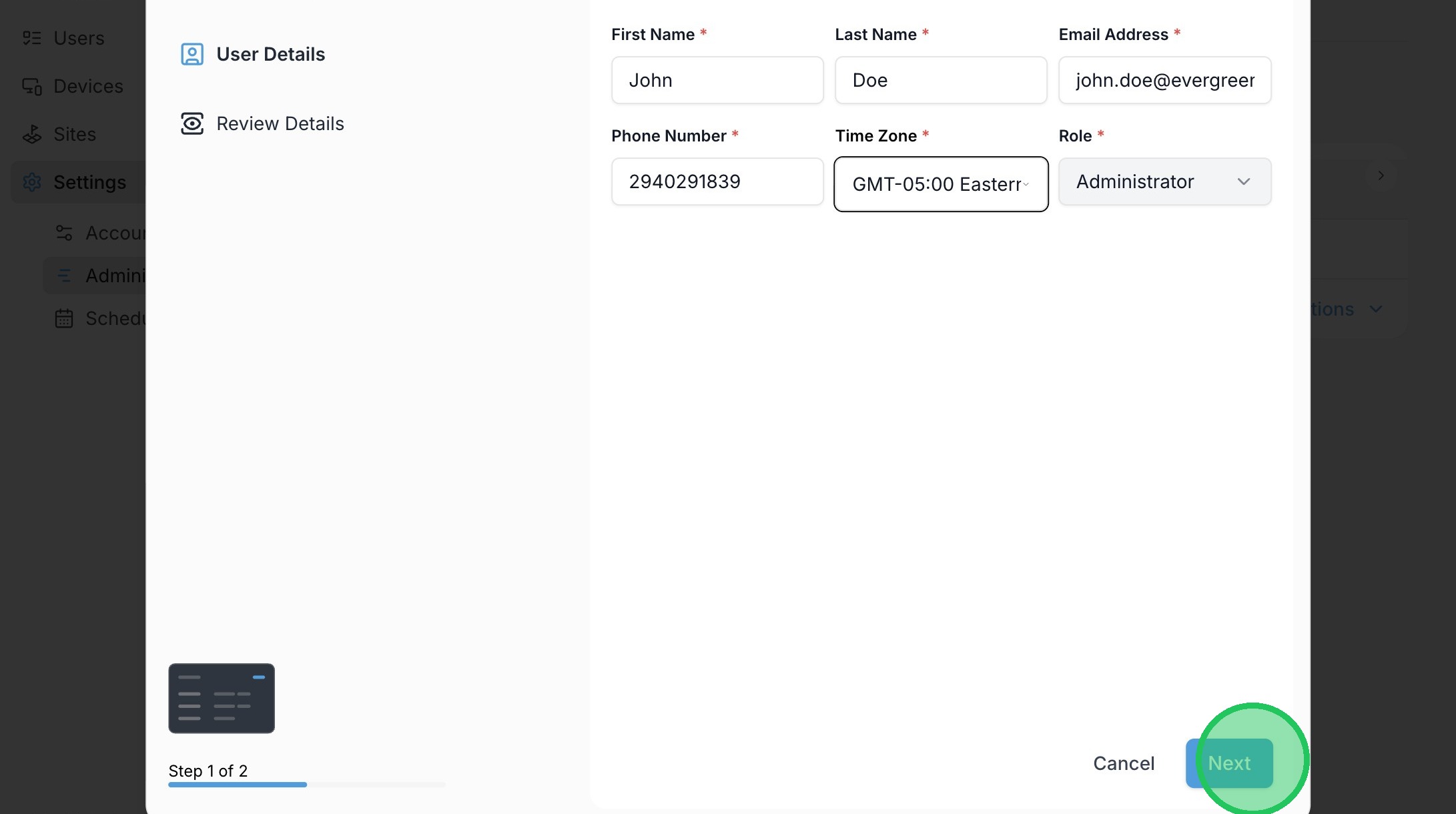 5. Fill out the administrator information and click "Next"