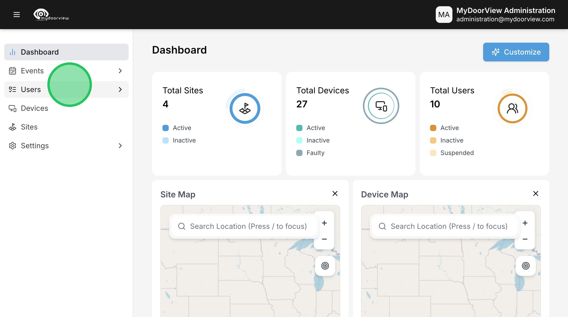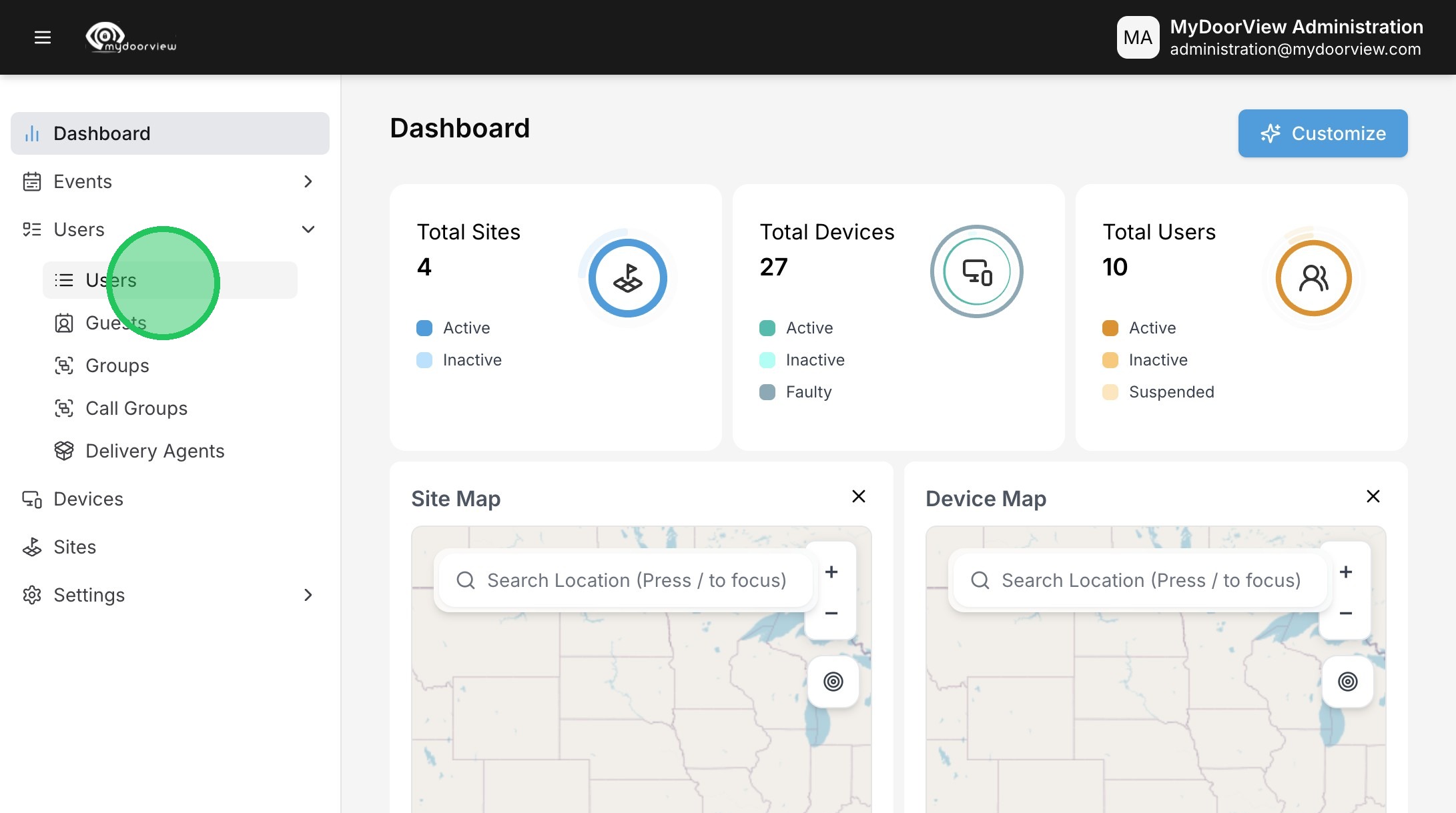1. Navigate to https://account.mydoorview.com/ as an end user. If you're a dealer/partner, please navigate to partner.mydoorview.com and follow the remote access guide. ***Please note that users should only be added manually for standalone accounts. Accounts using an integration for user sync should enter users into the access control system and ensure the users are assigned to the group that is being synced with MyDoorView.***