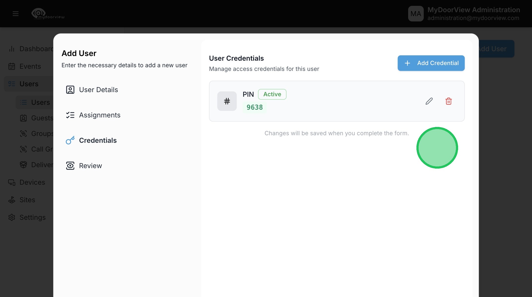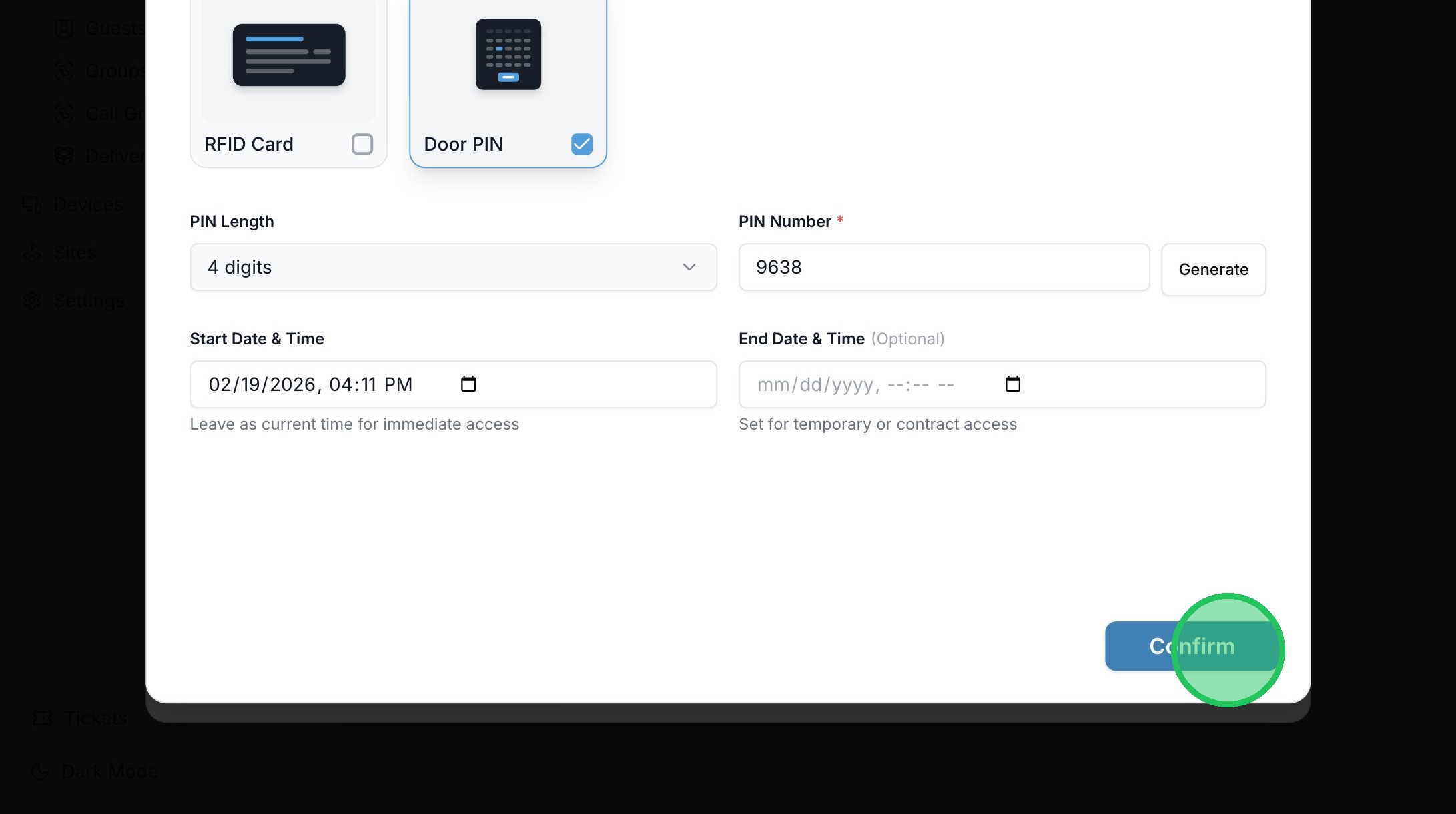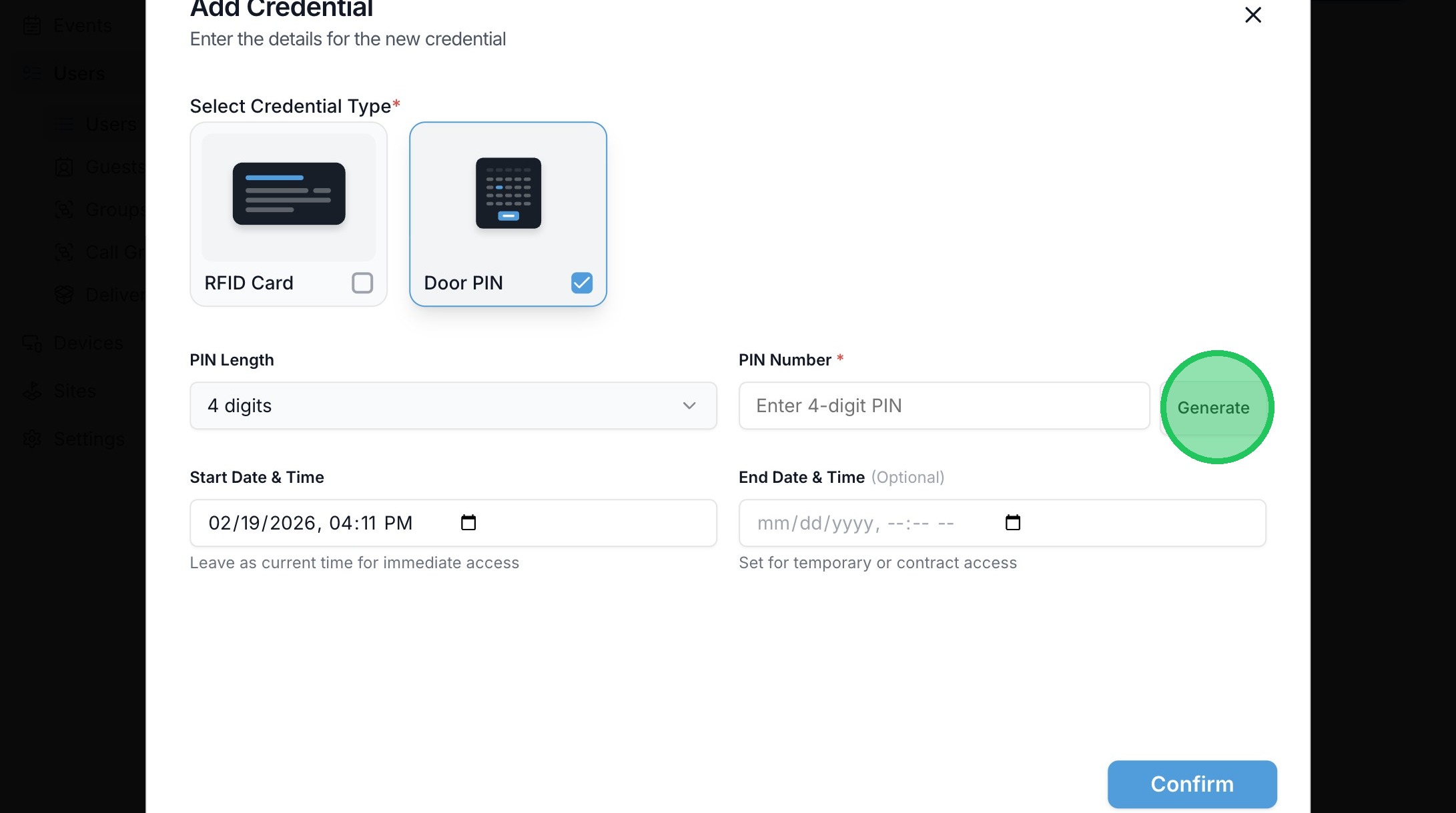 13. When adding a Door PIN, the credential can be randomly generated with the "Generate" button, or entered in manually.