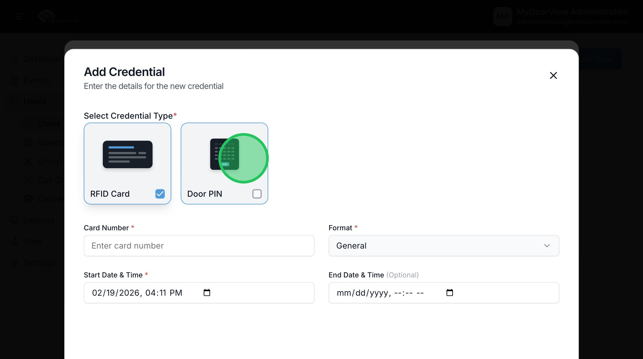 12. Select the desired credential type. If adding a Door PIN or RFID, the opposite credential can be added later.