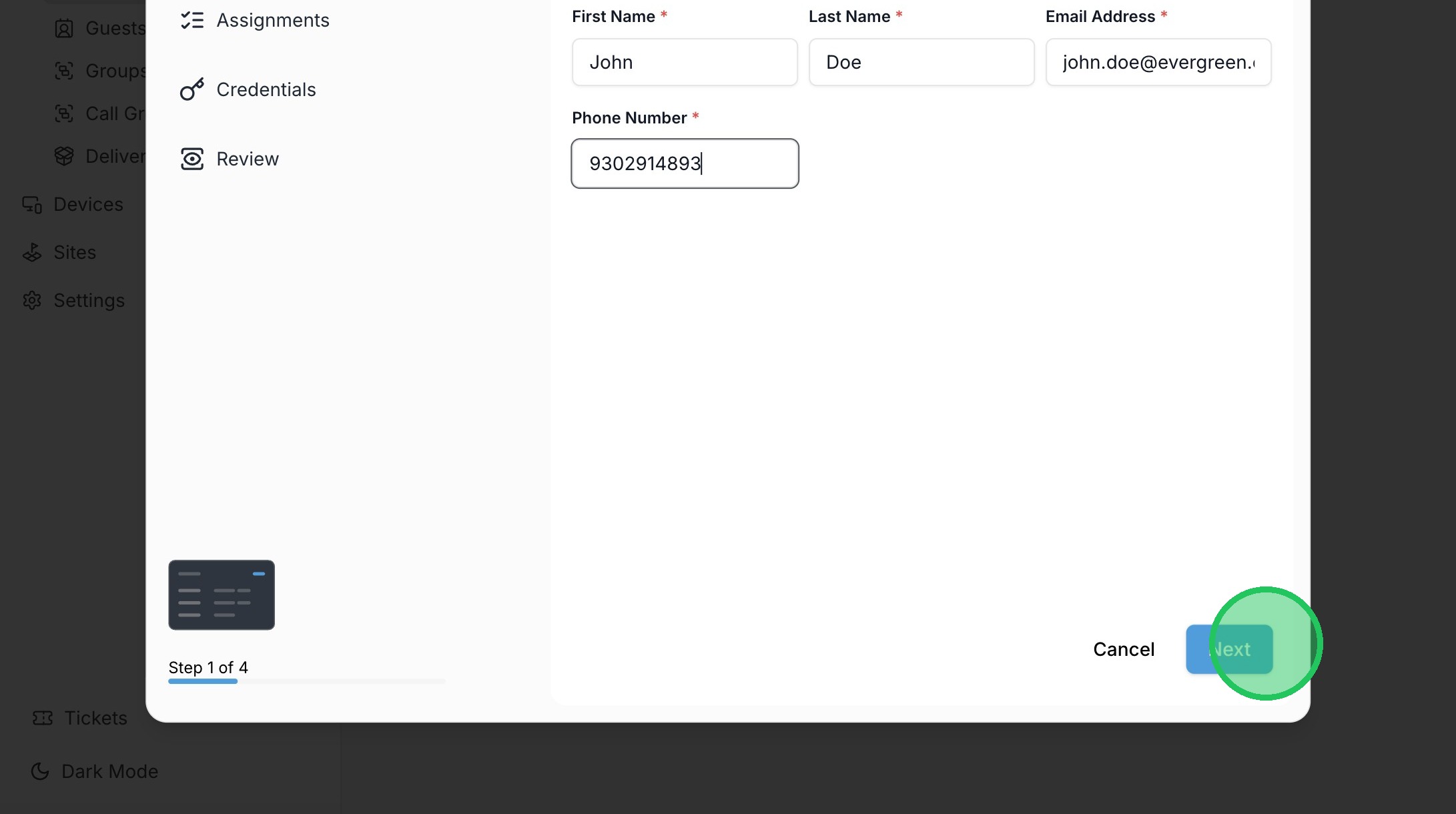 7. Fill out the form with the user's information.