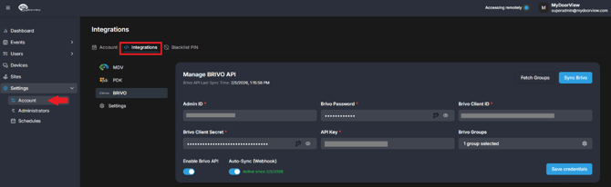 - Paste those values into the Brivo API credentials location for the client account in the new MDV portal. The location is Settings>Account>Integrations under the Manage Brivo API section