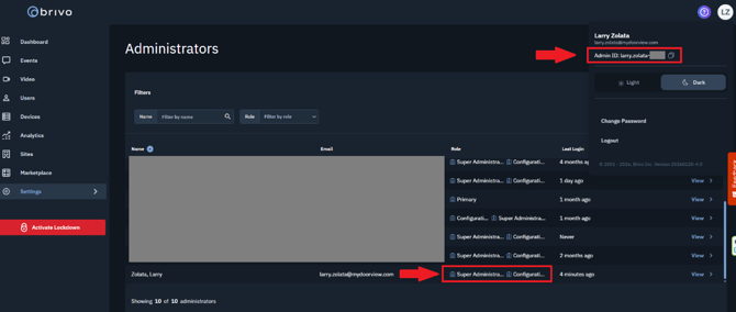The picture below shows where that info is found on the Brivo Access website. If you click on the circle at the top right with the user initials, there should be Admin ID as shown below. If Admin ID is not shown, then the proper Admin credentials are not in effect for that account.